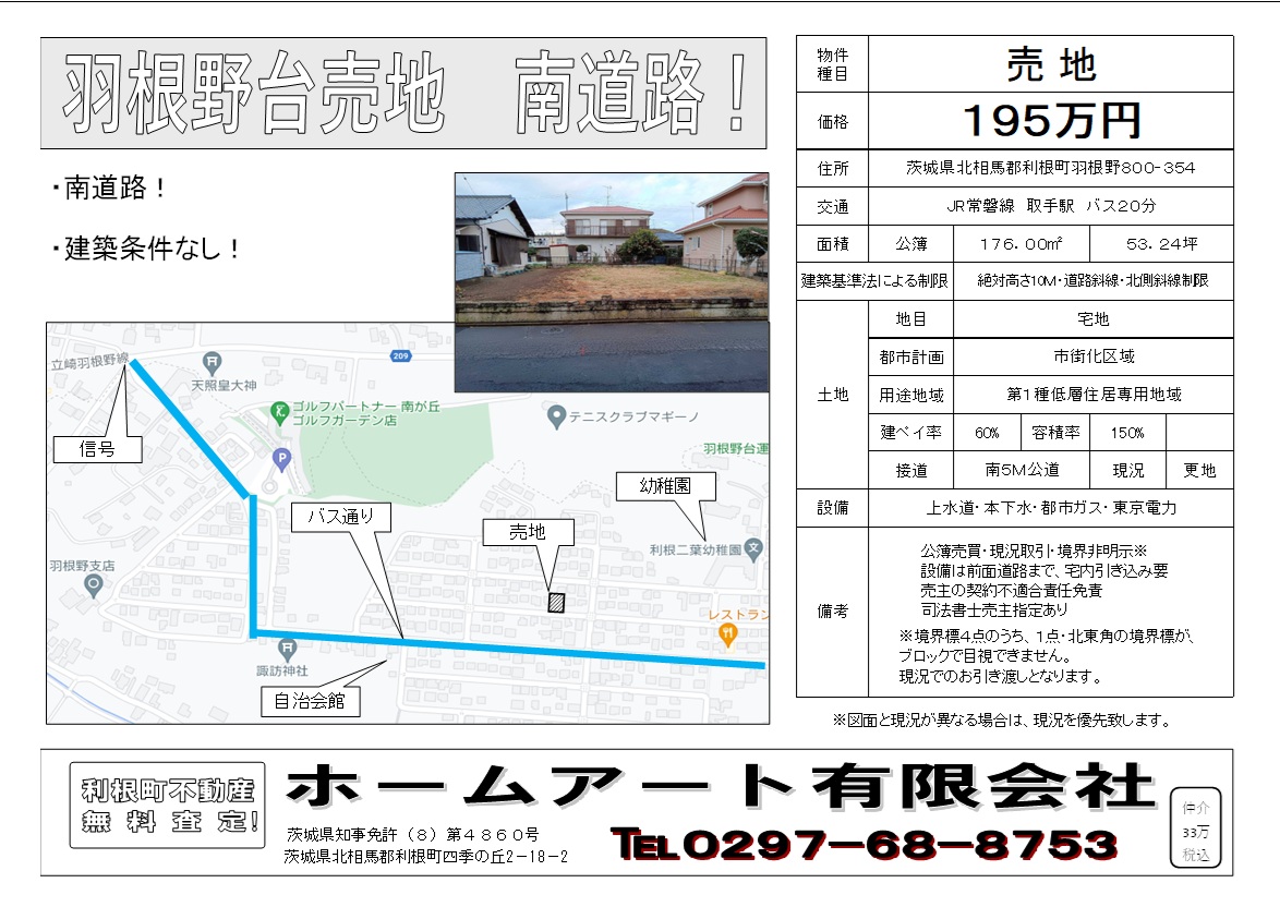 ![]() 利根町羽根野800-354 土地 176.00u(53.24坪) 南道路,建築条件なし |